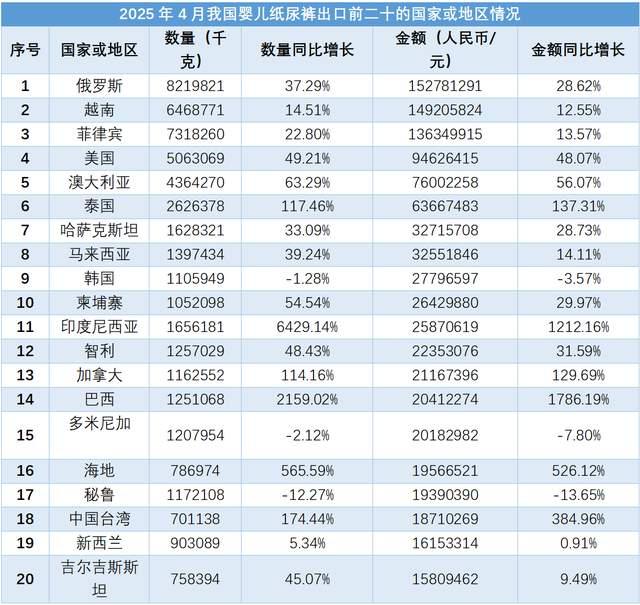從出口目的地來看,2025年4月我國嬰兒紙尿褲出口金額前10位的國家或地區依次是俄羅斯、越南、菲律賓、美國、澳大利亞、泰國、哈薩克斯坦、馬來西亞、韓國和柬埔寨。